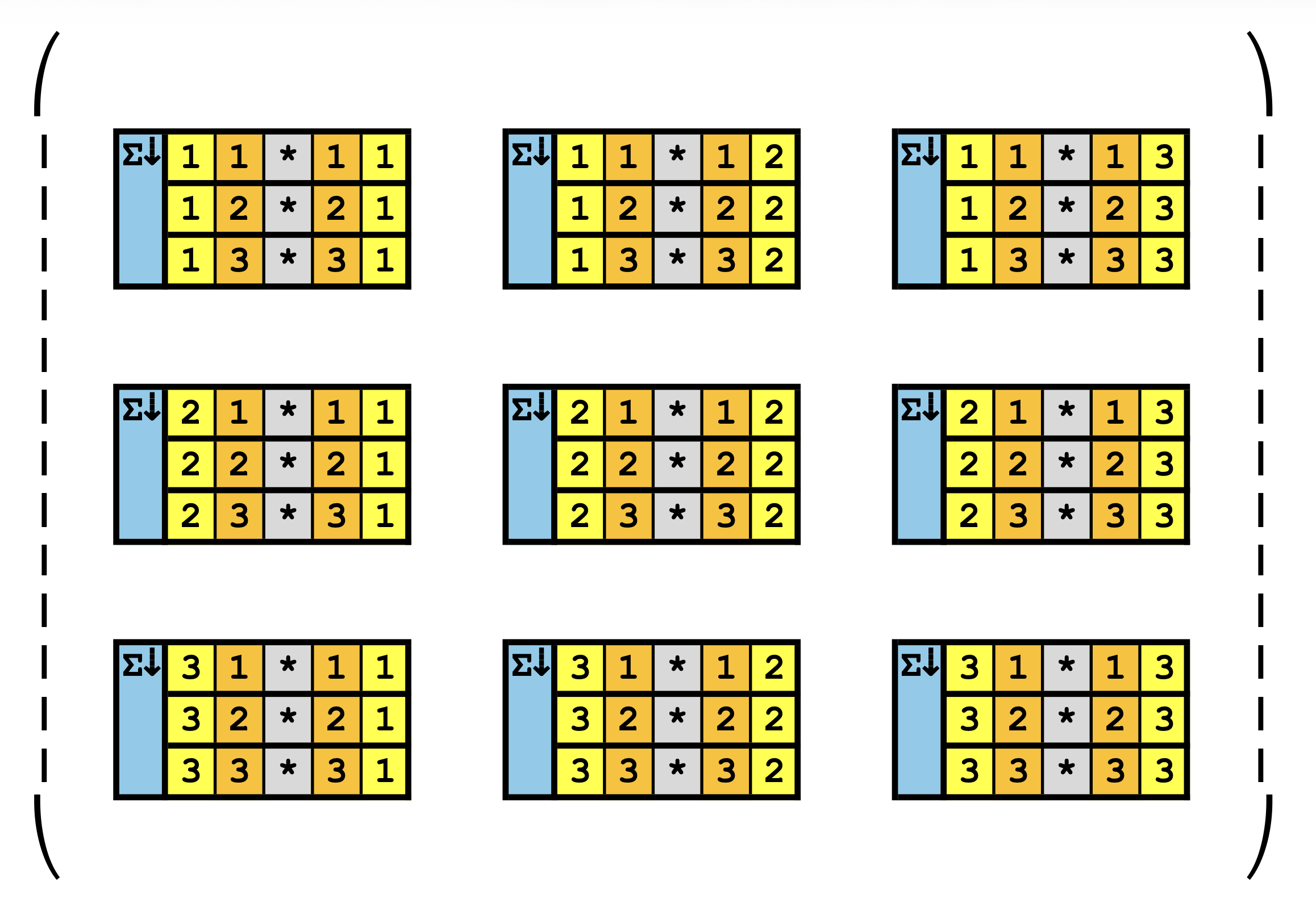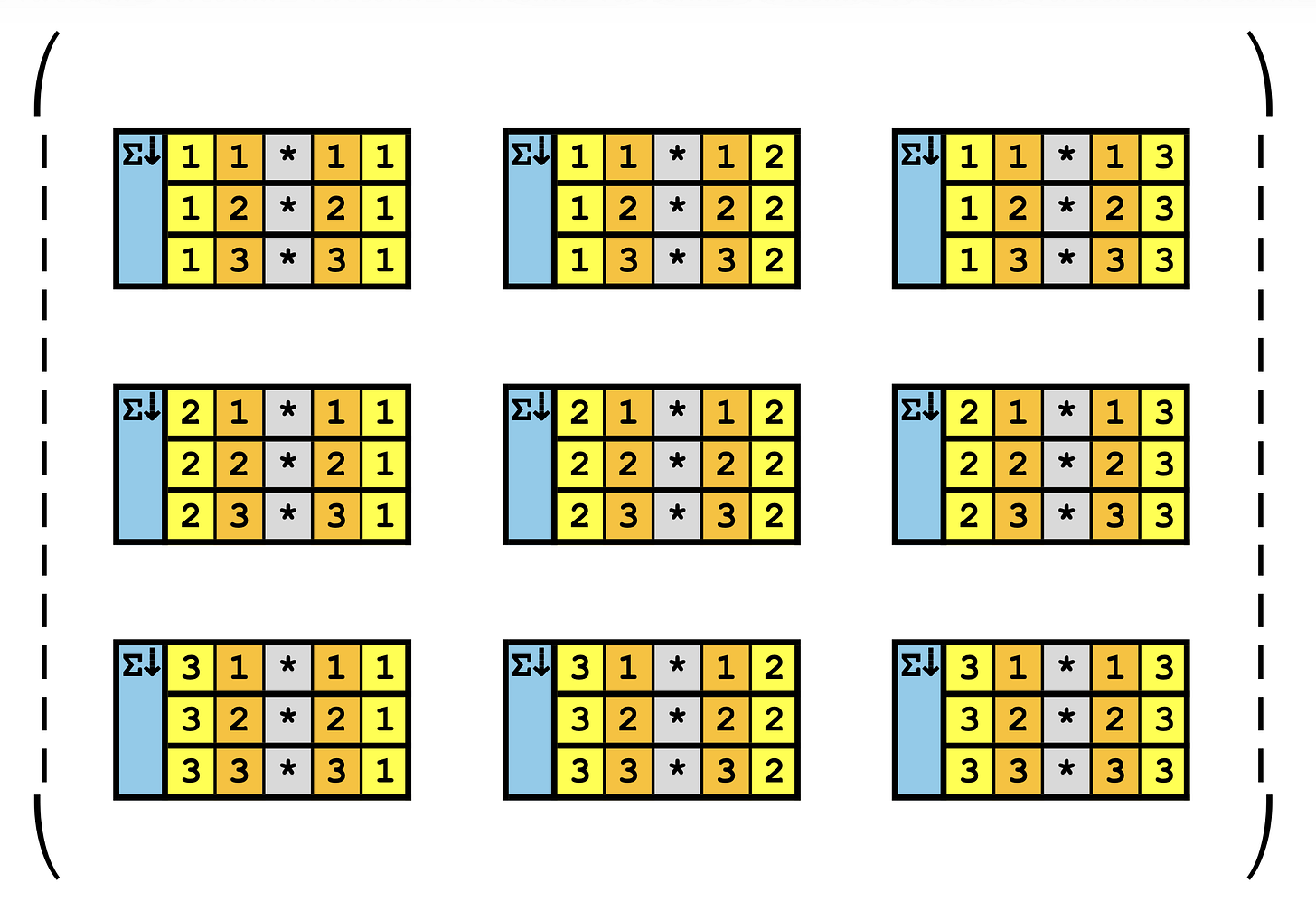 The other day, instead of the normal drill, I created this orderly chart. I hope you can see it on your phone if you are viewing it that way. It’s a representation of the output for a 3x3 matrix multiplication operation - and in color, too!